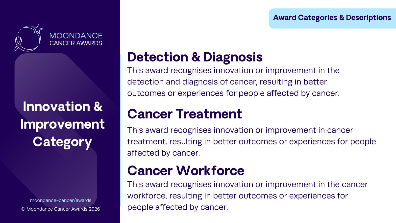 This category celebrates individuals and teams who have delivered ambitious and effective innovation or improvement within cancer services, resulting in meaningful improvement for people affected by cancer.
