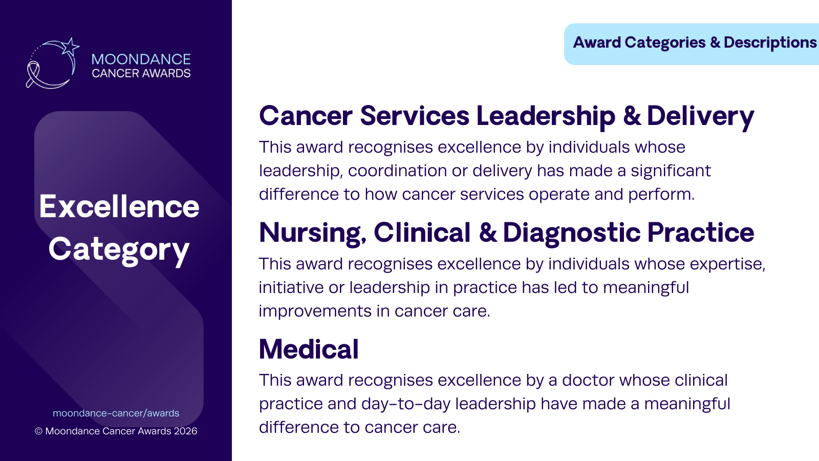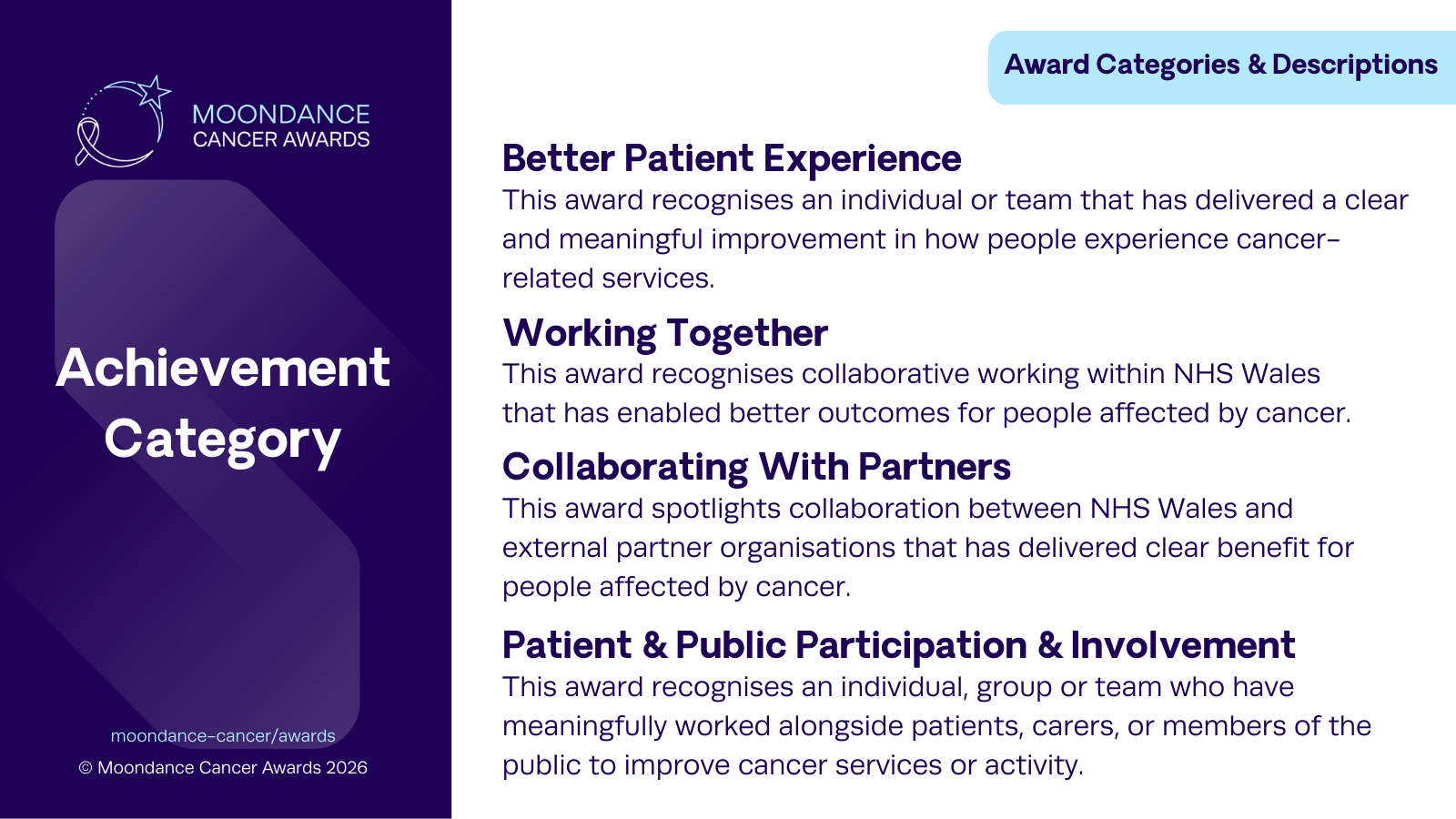 If you're ready to nominate, download the form here. Completed forms should be submitted to awards@moondance-cancer.wales